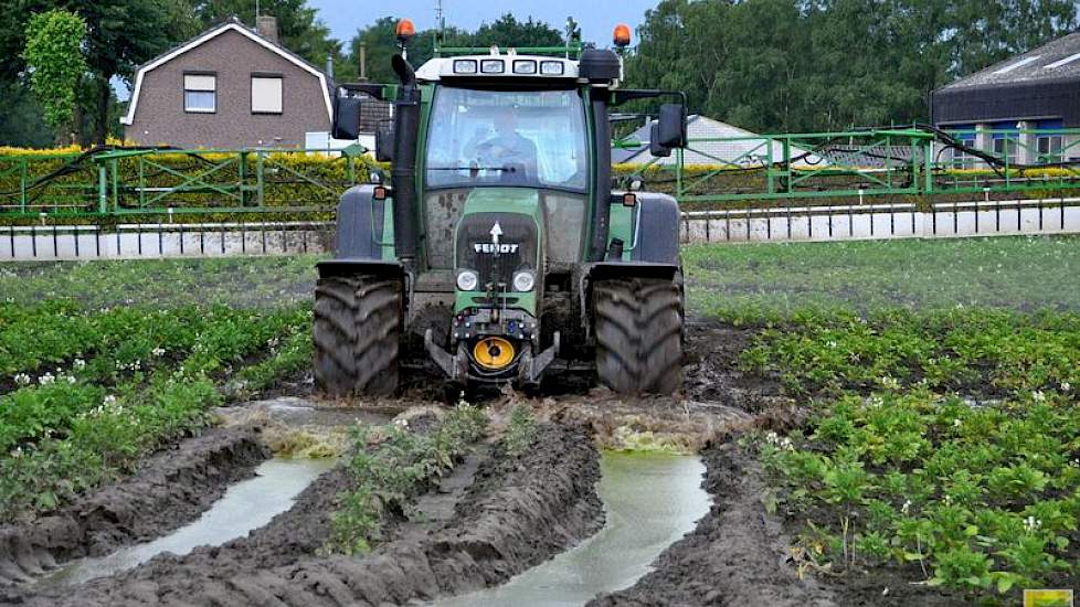 Akkerbouwer Rob Meeuwissen uit Gastel is aan het spuiten tegen phytophthora. Met twee trekkers worstelt hij door het perceel om zijn gewas te beschermen tegen de schimmelziekte. Het noodweer van de afgelopen weken begint steeds meer zijn tol te eisen. Ook bij Meeuwissen: volgens zijn inschatting is meer dan 70 procent van het areaal aardappelen bijna verloren. ‘Zo nat is het in dertig jaar niet geweest.’ Toch blijft hij proberen om te spuiten tegen phytopththora. Door de combinatie van vocht, zon en hogere temperaturen slaat de schimmelziekte toe in de percelen.Bekijk ook: Het blijft nat in Zuidoost-NederlandLees alles over het noodweer in het Dossier op Akkerwijzer