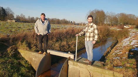 Pedro Vogels (links) en Geert van den Biggelaar bij een stuw in een waterschapssloot die ook in de laagste stand nog volop stroomt.