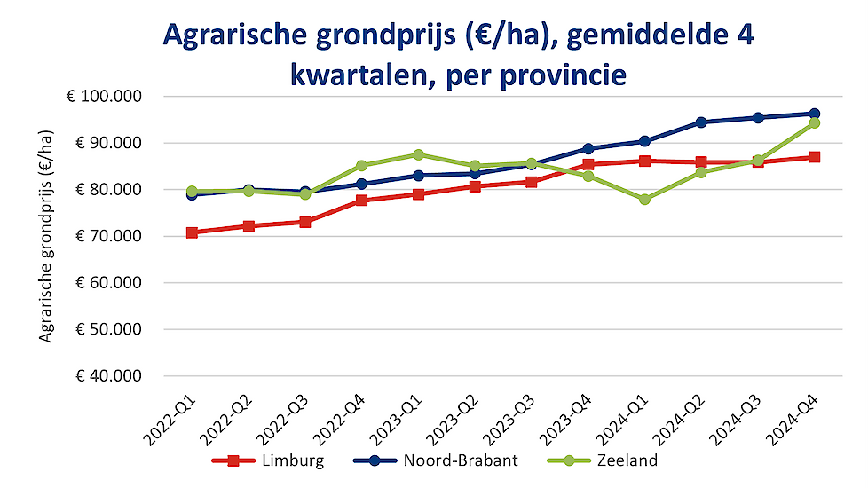 De gemiddelde agrarische grondprijs in Nederland is in het vierde kwartaal van 2024 met 8,8 procent gestegen vergeleken met het derde kwartaal: van 83.900 naar 91.300 euro per hectare. Over heel 2024 is de grondprijs uitgekomen op 85.300 euro per hectare. Dat is 8,3 procent hoger dan in 2023 (78.800 euro per hectare).
