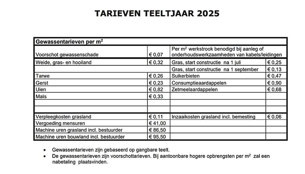 LTO en het Platform Leg- en Ligrechten brengen sinds 2021 jaarlijks een lijst met (voorschot)tarieven bij gewasschade naar buiten. Binnen het Platform Leg- en Ligrechten zijn veel kabel- en leidingbeheerders verenigd. De tarievenlijst kan voor zowel een grondeigenaar en -gebruiker als leidingbeheerder een houvast bieden bij het maken van afspraken over schade.