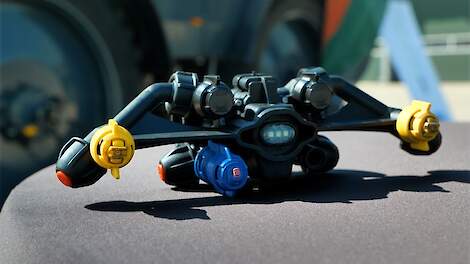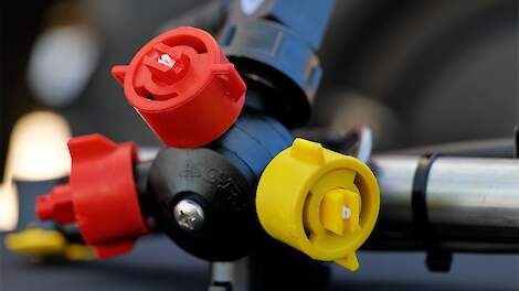 Importeur Kamps de Wild presenteerde een elektrische dopschakeling, die aangestuurd wordt vanuit de cabine of op basis van spuitdruk de doppen automatisch laat schakelen. „Grote voordeel daarbij is dat er van 50 naar 25 centimeter wordt geschakeld, maar dat in deze configuratie ook rijenbespuiting uitgevoerd kan worden”, vertelt Erwin Tessers van Kamps de Wild. De dopafstand is door middel van een brug op 12,5 centimeter gezet. „Daarmee kunnen we zowel op 75 als 50 centimeter een standaard rijenbespuiting uitvoeren, maar ook een vrije configuratie is mogelijk.” Met een verlaagde spuitboomhoogte van 25 tot 30 centimeter boven het gewas is mogelijk met een tophoek van 80 of 90 graden. „Met deze combinatie voldoet Amazone aan een driftreductieklassen van 95 procent. Dankzij drie sensoren aan beide zijden kunnen we met de proactieve boomgeleiding iedere positie van een spuitboom van maximaal 48 meter regelen.”