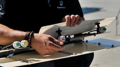 Denick Murraij van Wingssprayer gaf tekst en uitleg over de wing die gemonteerd wordt onder een boom van een standaard veldspuit, waarmee een driftreductie van 99,8 procent gerealiseerd wordt. „De werking berust op een principe waarbij de wing over het gewas beweegt, door de rijwind ontstaat er aan de achterkant van de wing onderdruk. In combinatie met de rijwind die aan de voorkant binnenkomt, creëren we een luchtstroom die het middel uit de doppen het gewas instuurt. Met een dubbele wing creëer je een tweede luchtstroom voor extra kracht om het middel het gewas in te krijgen.”
