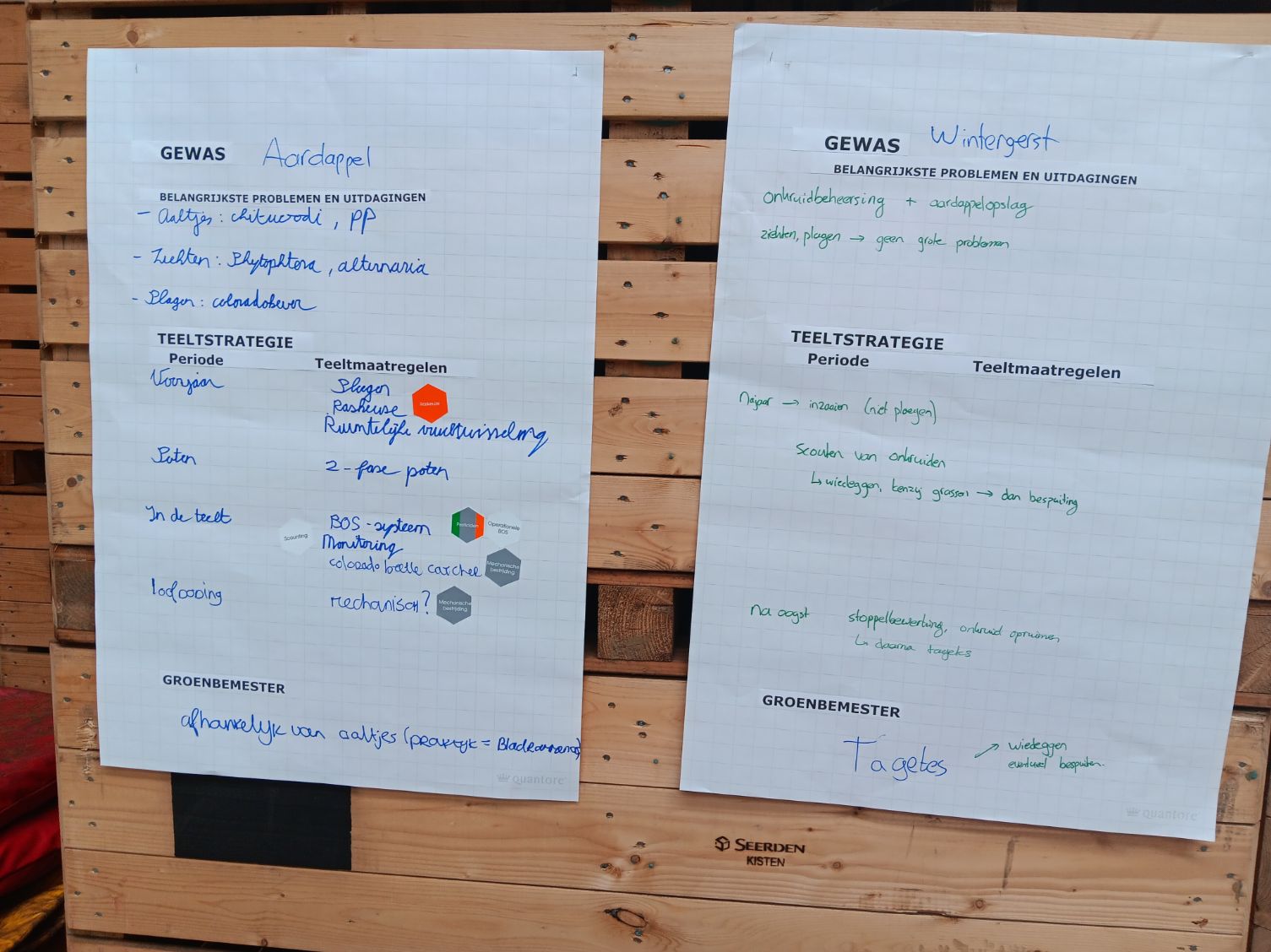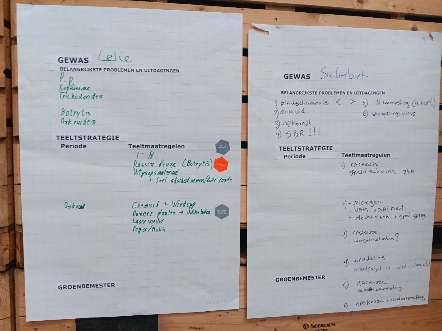 Met de boodschap van Huiting in het achterhoofd gingen de bezoekers van de velddag onder begeleiding van een team van experts van WUR aan de slag met de praktische invulling met hulp van het ICM-raamwerk. Daarbij was het doel om tot een integrale teeltstrategie te komen die past op de zuidoostelijke zandgronden. Dit werd gedaan aan de hand van verschillende casussen. Bij een van de casussen was de vraag of en hoe lelieteelt in een akkerbouwrotatie met de volgende gewassen zou kunnen passen: consumptieaardappelen (2x), wintergerst, suikerbiet (2x), peen, snijmais en zaaiuien. Deze gewassen zijn kenmerkend voor de teeltregio. De groep werd opgesplitst in subgroepen, waarbij elke groep aan de slag ging met het maken van een bouwplan en elk een focuspunt toebedeeld kreeg: onkruiden, ziekten, plagen of nematoden. De onderstaande fotoserie geeft een inkijkje in de bevindingen die zijn gedaan.