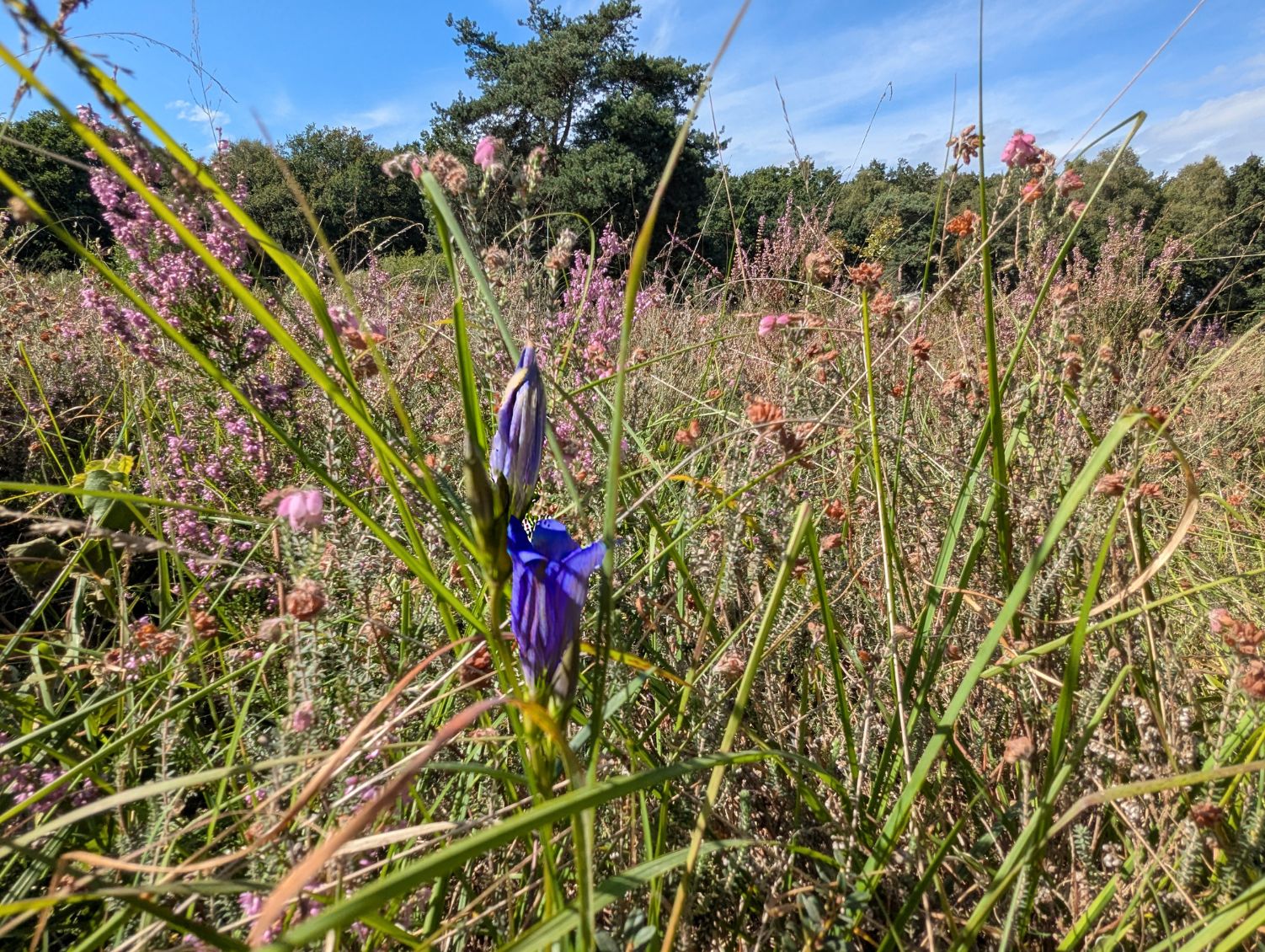 De volgende stop is bij het zeer zeldzame kalkmoeras. Medewerkers van Staatsbosbeheer maaien het kwetsbare stukje natuur met een kleine machine en trekken het maaisel met een lier naar hoger gelegen terrein. Aan de rand is nog zichtbaar hoe het er daarvoor uitzag, doordat er nog resten van riet staan. Op mijn vraag aan een medewerker of er nog bijzondere planten staan, moet hij het antwoord schuldig blijven. Hij wijst me wel op een klokjesgentiaan die iets verderop staat tussen de dopheide. Ook op dat heideterrein is flink gemaaid met uitzondering van de delen waar de dichtheid van heideplanten groter is. Daar staan ook een paar exemplaren van de klokjesgentiaan.