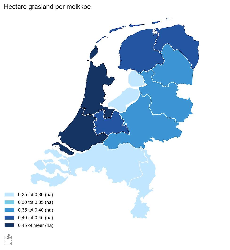 In Noord-Holland is de meeste ruimte beschikbaar, met 0,49 hectare grasland per melkkoe. Zuid-Holland komt op de tweede plaats met 0,45 hectare. Dit zijn ook de twee provincies waar koeien het vaakst in de wei lopen. In Noord-Brabant heeft een melkveebedrijf gemiddeld 0,25 hectare grasland per melkkoe, het laagste van alle provincies. Flevoland komt op de tweede plaats met 0,26 hectare.