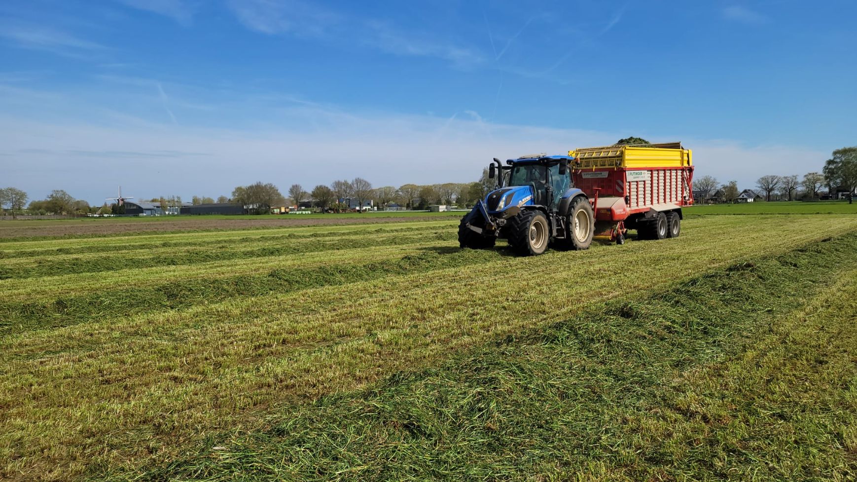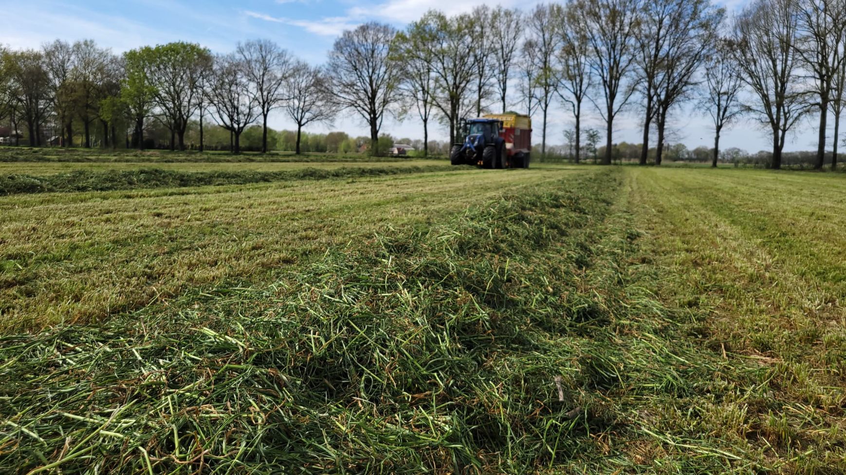Gras in het zwad met op de achtergrond de opraapwagen