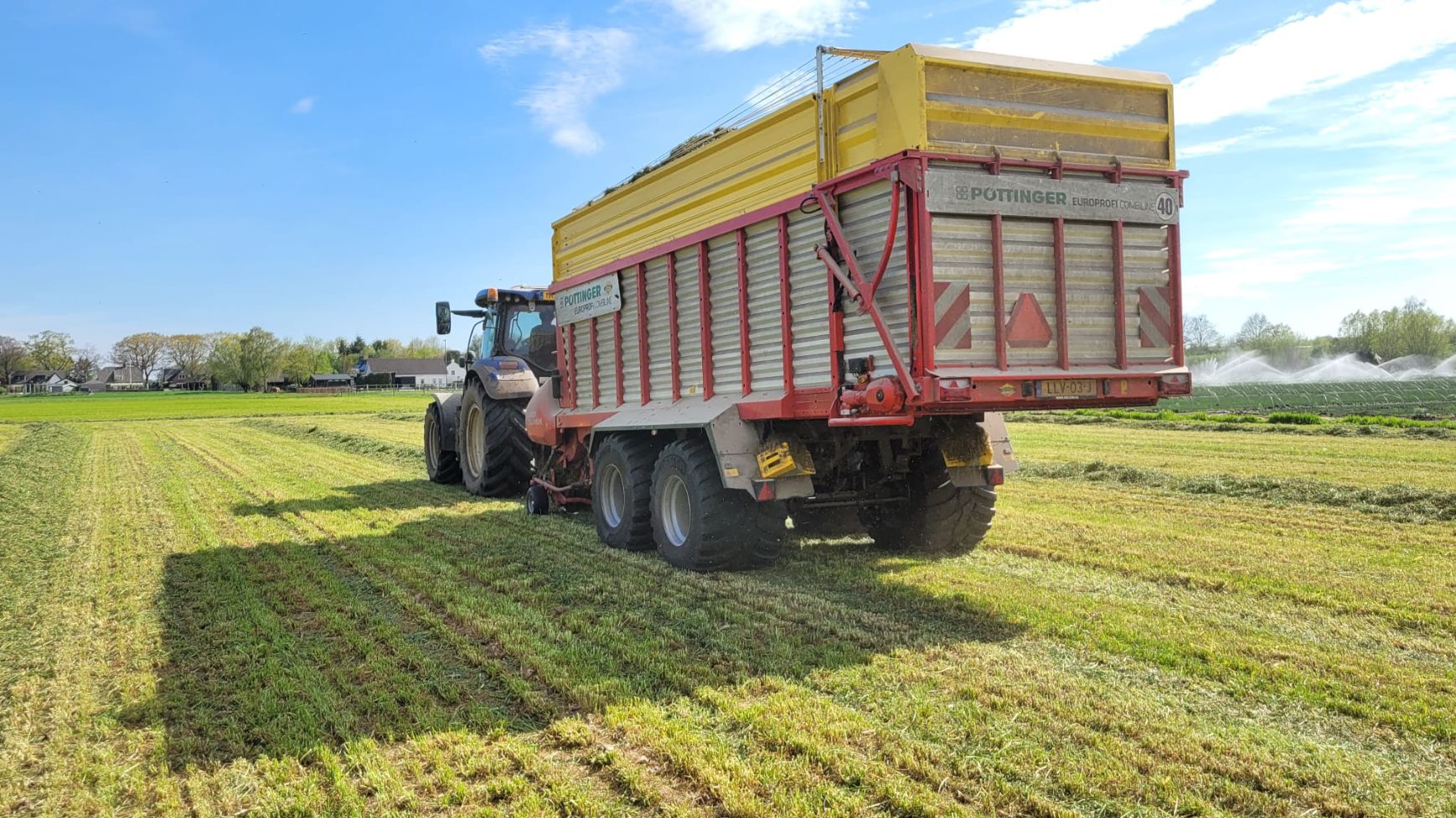De opraapwagen verwerkt het gras onder goede omstandigheden: droog land en voldoende draagkracht maken een vlotte oogst mogelijk.