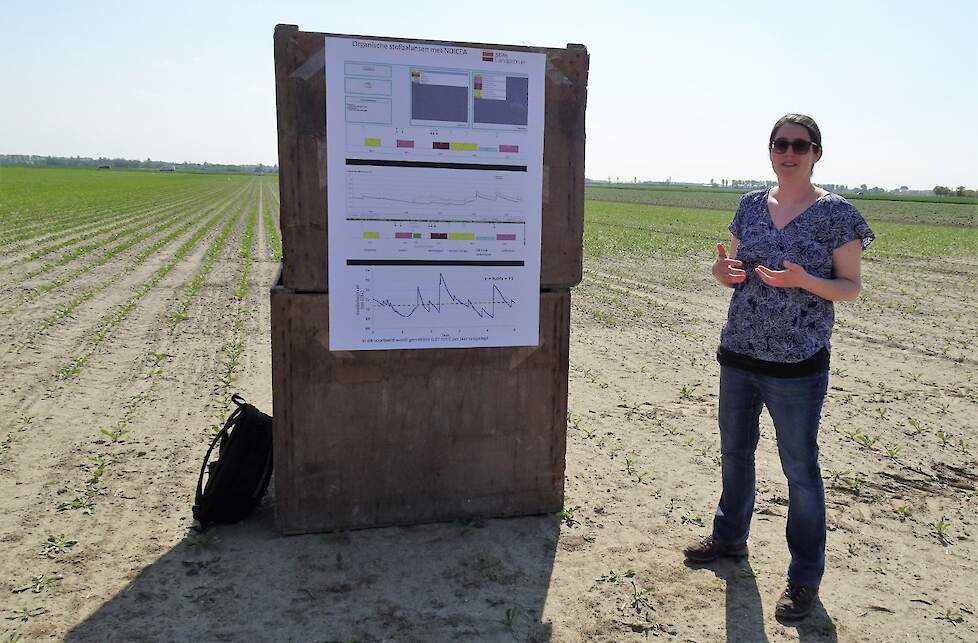 Akkerbouwer en vicevoorzitter van de ZLTO-afdeling Tholen, Jan de Wilde uit Sint-Maartensdijk, luistert tijdens het veldbezoek aandachtig naar wat projectleider Bodem en Teelt bij Louis Bolk Instituut, Marianne Hoogmoed, vertelt over de NDICEA stikstofplanner. Het computerprogramma geeft inzicht in de stikstof- en organische stof huishouding van een boerenbedrijf.